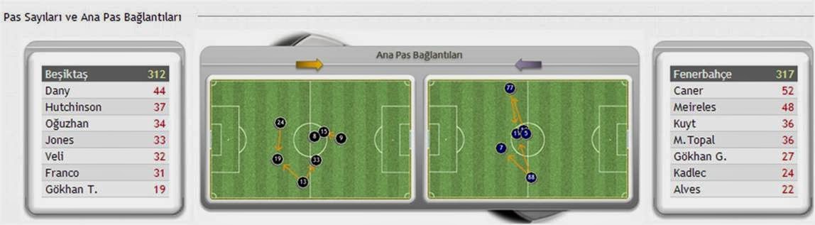Beşiktaş’ta özellikle Dany’nin topla en fazla oynayan oyuncu olduğunu görüyoruz. Ana pas bağlantıları çoğunlukla iki stoper Dany- Motta ve sağ bek Hutchinson üzerinden Jones’a olduğunu görüyoruz. Fenerbahçe’de ise bu durum biraz daha farklı işliyor; iki kanat beki Caner ve Gökhan’ın ana pas bağlantılarını kurduğunu görüyoruz. iki oyuncu da orta alana doğru  Meireles, Kuyt, Sow ve Topal ile pas alışverişi içinde oldular. Bu noktada Emenike’nin ileriye dönük bağlantıda kopuk olan nokta olduğunu söylemek sanırım yanlış olmaz.