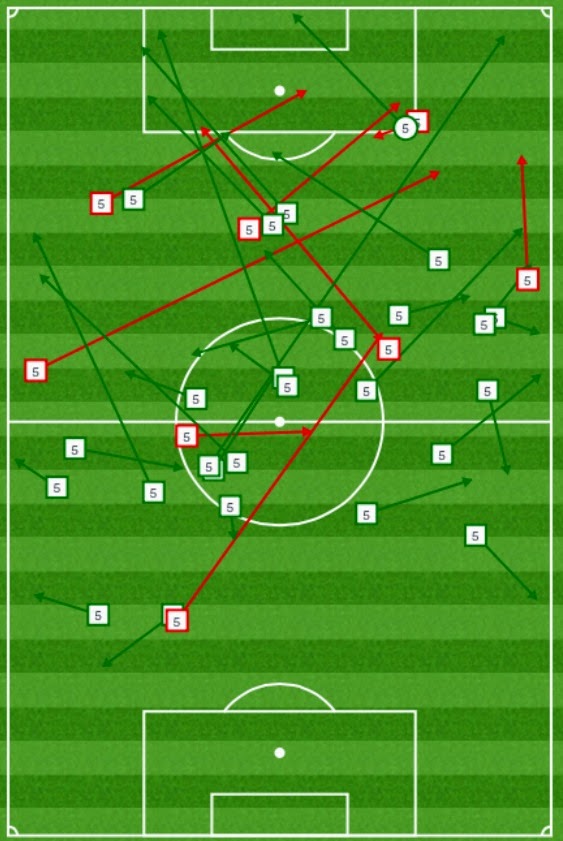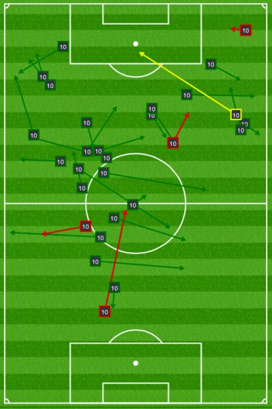 Caner’in 35. dakikada oyundan çıkışına kadar yaptığı 5 orta Gökhan ve Meireles ile birlikte Fenerbahçe’de en fazla orta yapan oyuncu olması önemli. Hasan Ali’nin bu anlamda katkısı 2 orta ile sınırlı kaldı. Fenerbahçe’nin oyun anlayışında kanat kullanımı önemli. Diego bu noktada takıma ne katacak onun için bir süre daha beklemek gerek. 55. dakikada sakatlanarak çıkana kadar oyun içindeki pas bölgelerine bakalım;