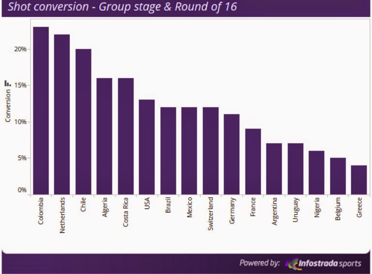 Bir diğer çeyrek final karşılaşmasında Brezilya’ya bakacak olursak %14 olan oran son 16 maçı ile birlikte %12’ye düşüyor. Brezilya’nın rakibi Kolombiya’nın şutlarına dikkat etmesi gerekiyor. Zira %23 gibi bir grup maçı şut/gol oranı varken son 16 maçında bu oranı 43 şut atarak %23’te tutmayı başardılar. Son 8 içindeki şutu gol çevirme oranı en yüksek ekip olarak dikkat çekiyorlar.