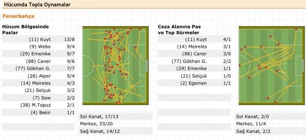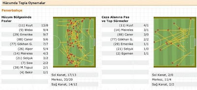 Fenerbahçe’nin kanatları çalışıyor mu? Rakamlara baktığımızda sol kanattan yapılan 6 ortanın 2 sinin isabetli olduğunu görürken sağ kanattan yapılan 10 ortanın hiçbirisinin (!) isabetli olmadığı dikkat çekiyor. Burada yapılan ortaları mı eleştirmek gerek yoksa bu durumu ileride çoğalamama sıkıntısı olarak mı açıklamak lazım bilemiyorum.
