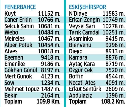 Fenerbahçe, toplamda 109.8 km koşmuş. Aslına bakarsanız daha önceki karşılaşmalara göre mesafede bir artış var, ancak karşısında Fenerbahçe’ye yakın koşmuş olan bir Eskişehir takımı da var.