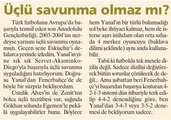 Evet Yanal’ın böyle birşey denemesi şu an için çok mümkün görünmüyor olabilir. Ancak bana neden olmasın dedirtti. Özellikle Alves’in bu oyunu biliyor olması ve eldeki mevcut ortasaha oyuncularını daha efektif kullanabilme adına acaba böyle bir değişim yapılabilir mi?