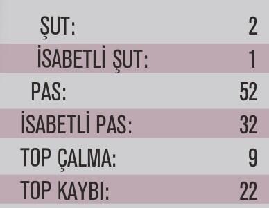 Daha önce de Alper’in bahsetmiş olduğum etkisizliğini bu tablodan da görebiliyoruz; topla oynama süresi 1’18”, sadece 19 pas yapmış ve %84 başarı ile oynamış.