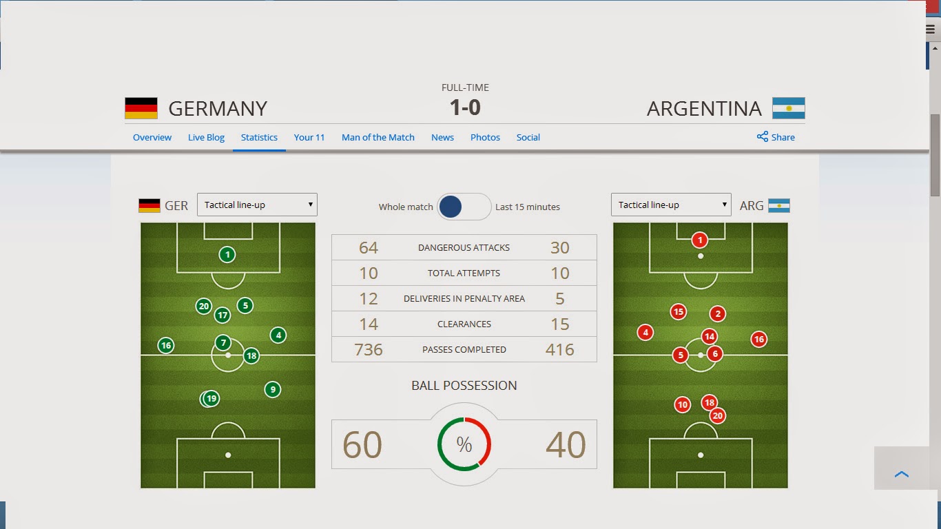 Finalde, %80 başarılı pas yüzdesi Almanların, %71 ise Arjantin takımının istatistiklerinde yer alıyordu. 915 pas Almanlar yaparken (ki 540’ı orta mesafe paslaşmalar, bu da atağa çıkarken yapıldığının göstergesi), 586 paslaşma da Arjantin’de vardı.