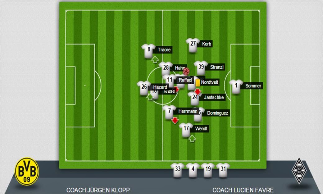 Monchengladbach ise 84.dakikaya kadar oyun anlayışını sahasına kapanıp kontra atak planı üzerine kurgulamıştı. 84.dakikada savunmanın kilit adamı Sokratis sakatlanıp çıkınca bir umut peşine düştüler belki ve ileriye çokça açılma fırsatı buldular. Zaten ceza sahasına yaptıkları 7 ortadan 6’sı bu bölümde geldi. Skor avantajını elinde tutan Dortmund ise fazla ileri açılmadı. Oyuncular belli ki skoru korumayı çok istediler, bunun yüzünden ileriye bu bölümde fazla açılmadılar.