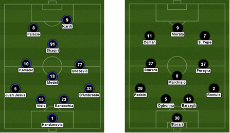 Inter ligin Juventus sonrası belki de en iyi orta saha rotasyonuna sahip takımı. Kısa ve seri paslar ile topu ayağında tutmaya çalışan takım maç başına %60 topla oynama istatistiği yakalamış durumda. Birbirine yakın oynayıp aralarındaki bağlantıyı koparmamaya çalışan Inter orta sahası maç başına %84,7 başarılı pas ile ligin en yüzdeli pas yapan ikinci takımı. Yetenekli ayakları ve derin paslar ile rakip defansın arkasına sarkmaya çalışan takım pas seçeneği bulamadıkça çözümü şut atmakta buluyor. Ligin en çok şut atan takımlarından biri olmalarının yanı sıra Inter maç başına 4,7 isabetli şut atıyor ve bu istatistik onları ligin lideri yapıyor. Inter Rodrigo Palacio, Mateo Kovacic gibi yetenekli isimler önderliğinde maç başına 11,5 ile ligin en fazla başarılı top süren ikinci takımı.