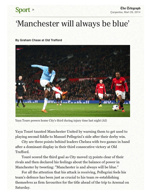 Maviler, 0-3’lük net bir skor ile Old Trafford’tan çıktı. Şampiyonluk yolunda çok önemli bir galibiyet olmanın yanı sıra derbi özelliği de maça ayrı bir önem kazandırmıştı. Son sözümü Yaya Toure’nin İngiliz gazetelerinin manşetlerine taşınan maç sonu iddialı demeci ile bitirmek istiyorum;