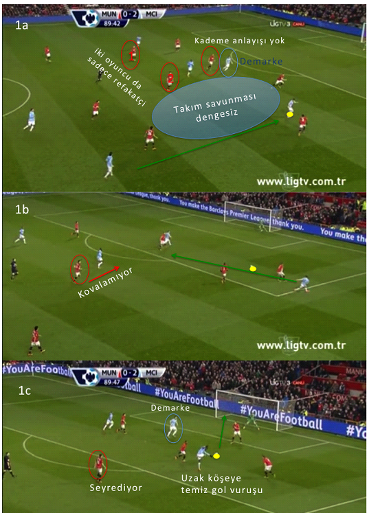 Nicelik değil nitelik daha önemli olabilir dedirten bir pozisyon. 5 kırmızılı kendi ceza alanını savunmaya çalışırken gol rakip takımın sadece iki oyuncusunun ceza alanındaki aksiyonundan geldi. United’lı oyuncuların maça “henüz” konsantre olmadıklarını ve yapılan pozisyon hatalarını görüyoruz. Bu seviyede yapılan bu tip pozisyon hataları puan alamayacağınız 90 dakikaları beraberinde getirebiliyor.