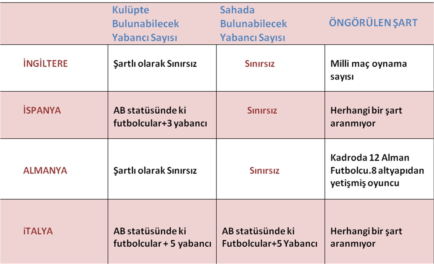 Son Olarak İtalya’ya baktığımızda ise İspanya ile benzer bir sisteme sahipler fakat İtalya’da AB statüsü+3 yabancı değil AB statüsü+5 yabancı kuralı mevcut. İtalyan futbolunun bu sisteme nasıl reaksiyon gösterdiği ise çok net bir şekilde bilinmez. Ülke olarak en çalkantılı futbol olaylarının,şike olaylarının patladığı sene Dünya Kupası’na uzanan bir takım olmakla birlikte her zaman sürprizlere açık bir Milli Takım’a sahipler.